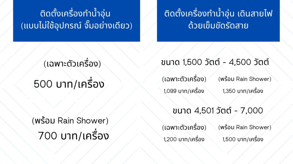เพื่อให้ปลอดภัยต่อผู้ใช้เครื่องทำน้ำอุ่นและเหมาะสมกับหน้างานที่ติดตั้ง อาจจะมีการคิดค่าใช้จ่ายเพิ่มเติมที่หน้างาน
